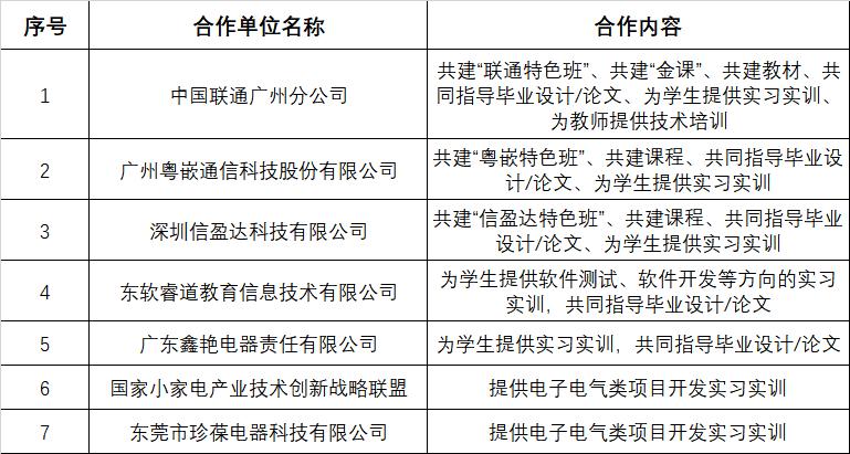 我院与广州拓胜计算机服务技术有限公司、东软睿道教育信息技术有限公司、广东粤嵌通信科技股份有限公司等十几家公司针对不同的专业进行了深度合作, 合作内容及模式如下: