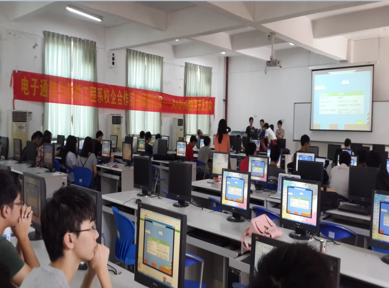 目前,我院和广州拓胜、粤嵌、中星针对不同方向进行了课程共建的深度合作。针对大三学生的综合实训课,不分专业,以学生为中心,由学生根据自身兴趣和特长选择实训方向。电软系分别开设了嵌入式系统与应用、网络综合设计与管理、Java Web程序设计实训、Android应用程序实训四个方向,实训周期为一个月。经过实训后的学生,技术及综合应能力显著得到了提升。下面为实训期间项目验收时的照片。