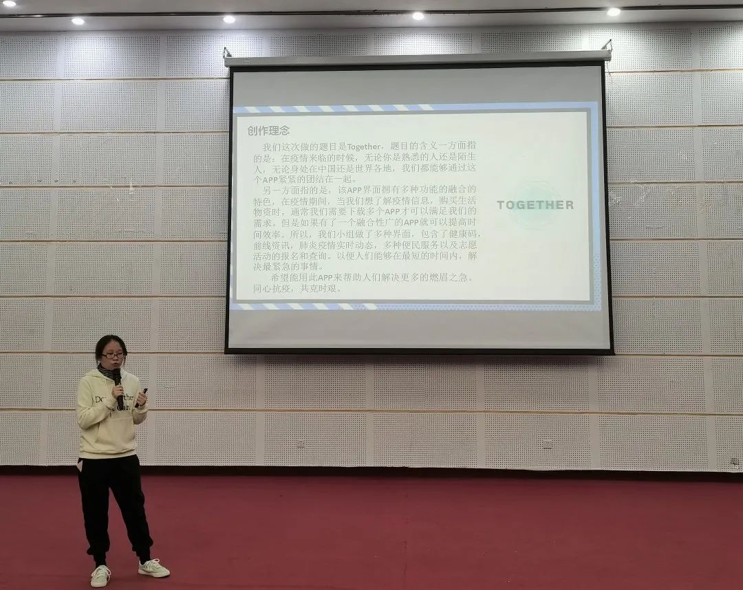 《Together》一方面指的是疫情来临的时候,无论你是亲人还是陌生人,我们都紧紧的团结在一起;另一方面指的是,多种功能的融合,界面包含了健康码,前线资讯,肺炎疫情实时动态,多种便民服务以及志愿活动的报名和查询。