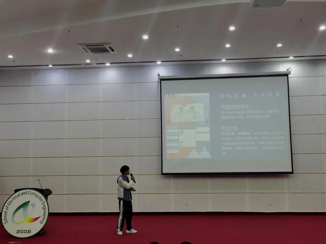 首先进行的是UI界面设计大赛的决赛,该比赛的主题为“专心抗疫,同屏共振”。本次比赛评委老师将从主题契合度、作品创意、作品色彩、文字设计和作品版式五个方面对参赛作品进行评分点评。