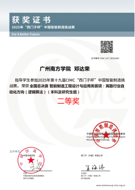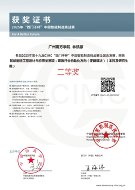 第19届“西门子杯”中国智能制造挑战赛全国总决赛于2025年8月11-15日在山西省太原市举行。我校suncitygroup太阳集团“零加一”队伍(成员:林凯豪、刘锦一、姜佳菥;指导老师:邓达荣老师)迎战强队、刻苦备战,历经激烈角逐,最终荣获“智能制造工程设计与应用类赛项:离散行业自动化方向(逻辑算法)(本科及研究生组)”二等奖。