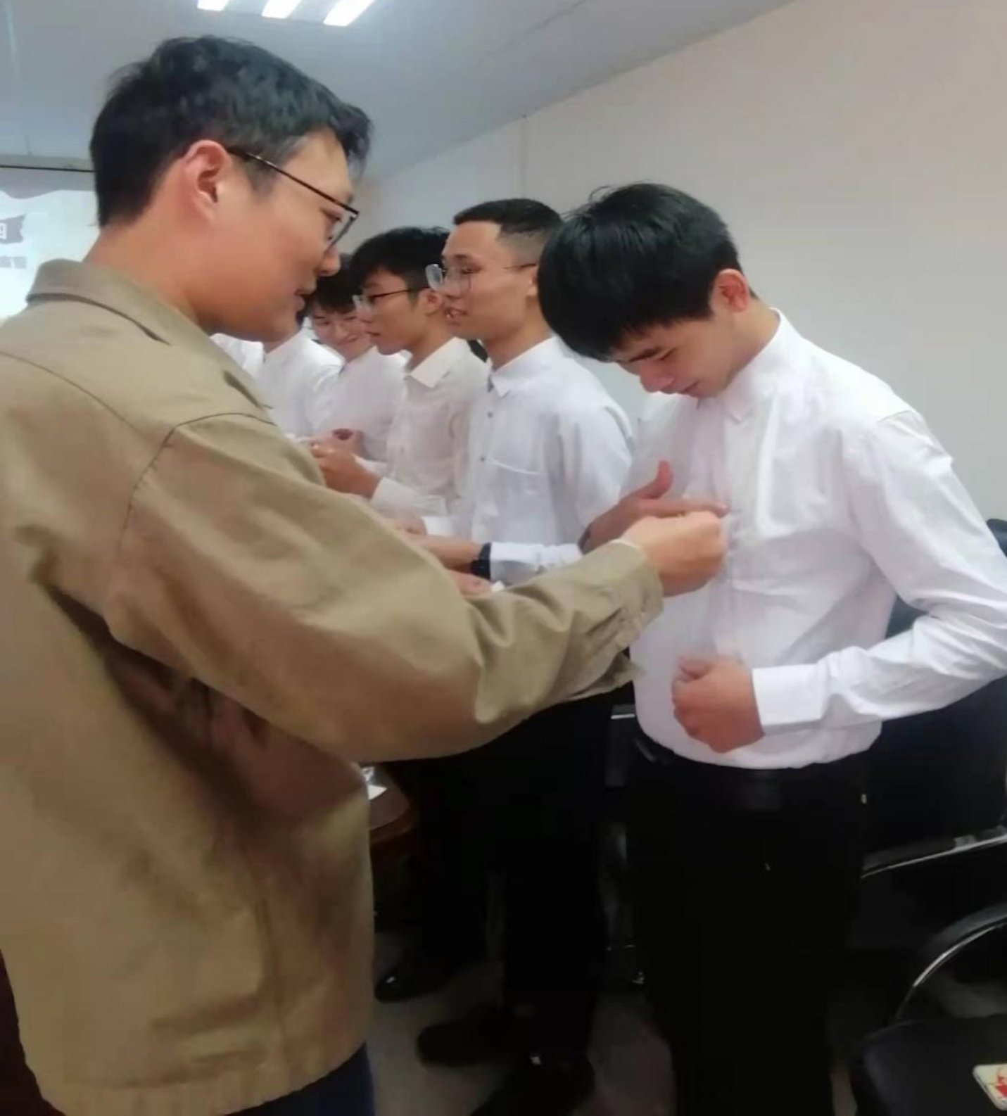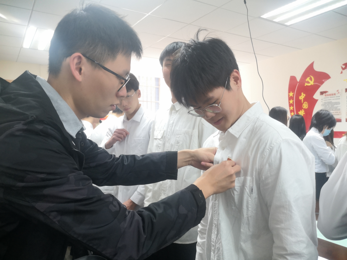 接着,各支部书记为新接收党员颁发并佩戴党员徽章。并在领誓人于柱峰同志的带领下,面向鲜红的中国共产党党旗举起右拳、庄严宣誓,铿锵有力的誓言表达了每一名新党员对党的忠心和为共产主义事业奋斗终生的决心。
