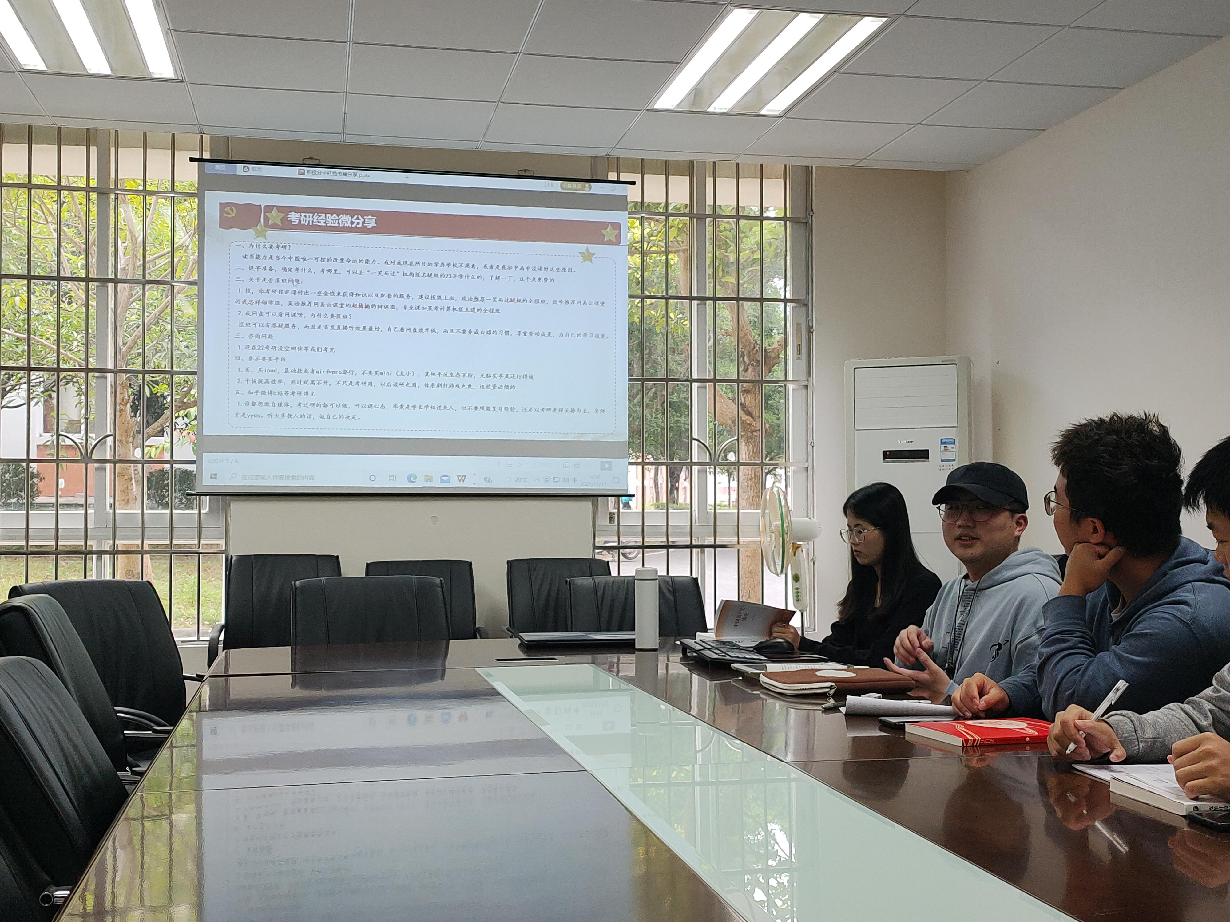 活动中,谢晓煌同志就自身的考研备考情况及具体备考计划为积极分子作考研经验。谢晓煌同志提出首先要确定自己是否真的需要考研,如果确定要考研就提前做好准备,提前了解自己考研的知识范围、地方范围,做出相关的规划,配套教育,以及要有坚持不懈、不怕苦的心态,这些就是考研大概的准备。