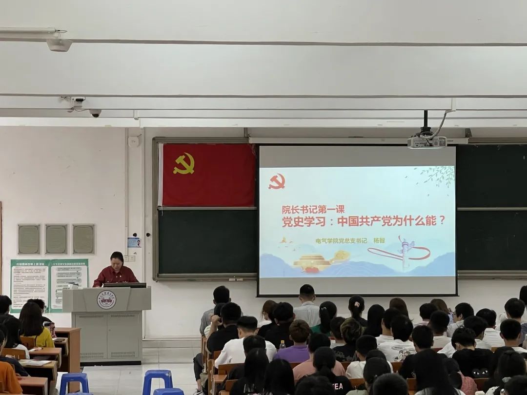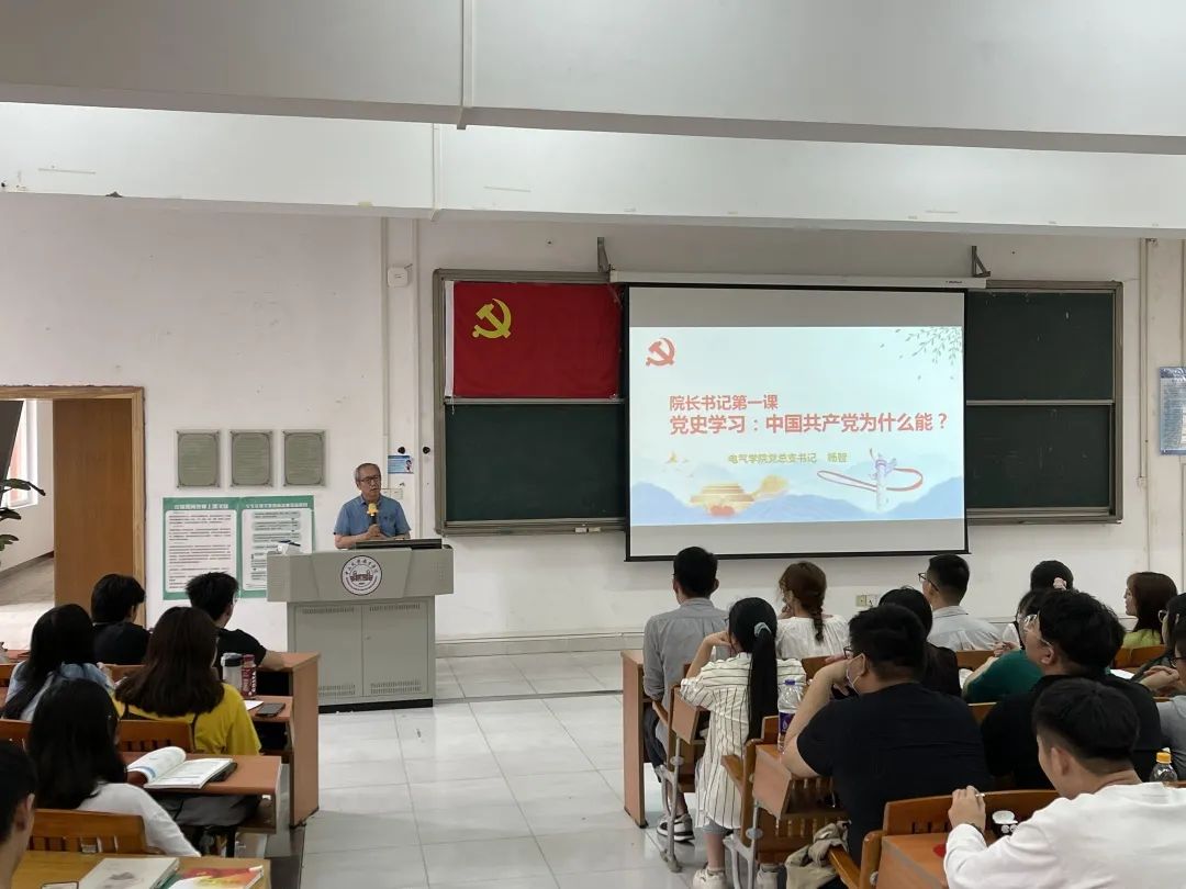 为贯彻落实习近平总书记提出的“全面开展党史学习教育活动”,继承革命先烈的光荣传统,更好地铭记感悟党的历史,2021年3月31日13:00,电气学院党总支在2教106开展了本学期的“院长书记第一课”。我院党总支书记、院长杨智教授以“中国共产党为什么能?”为主题亲自讲授,全体师生党员、入党积极分子、团学骨干共计300余人。全场座无虚席,气氛热烈,更是要临时加座满足听讲需求。