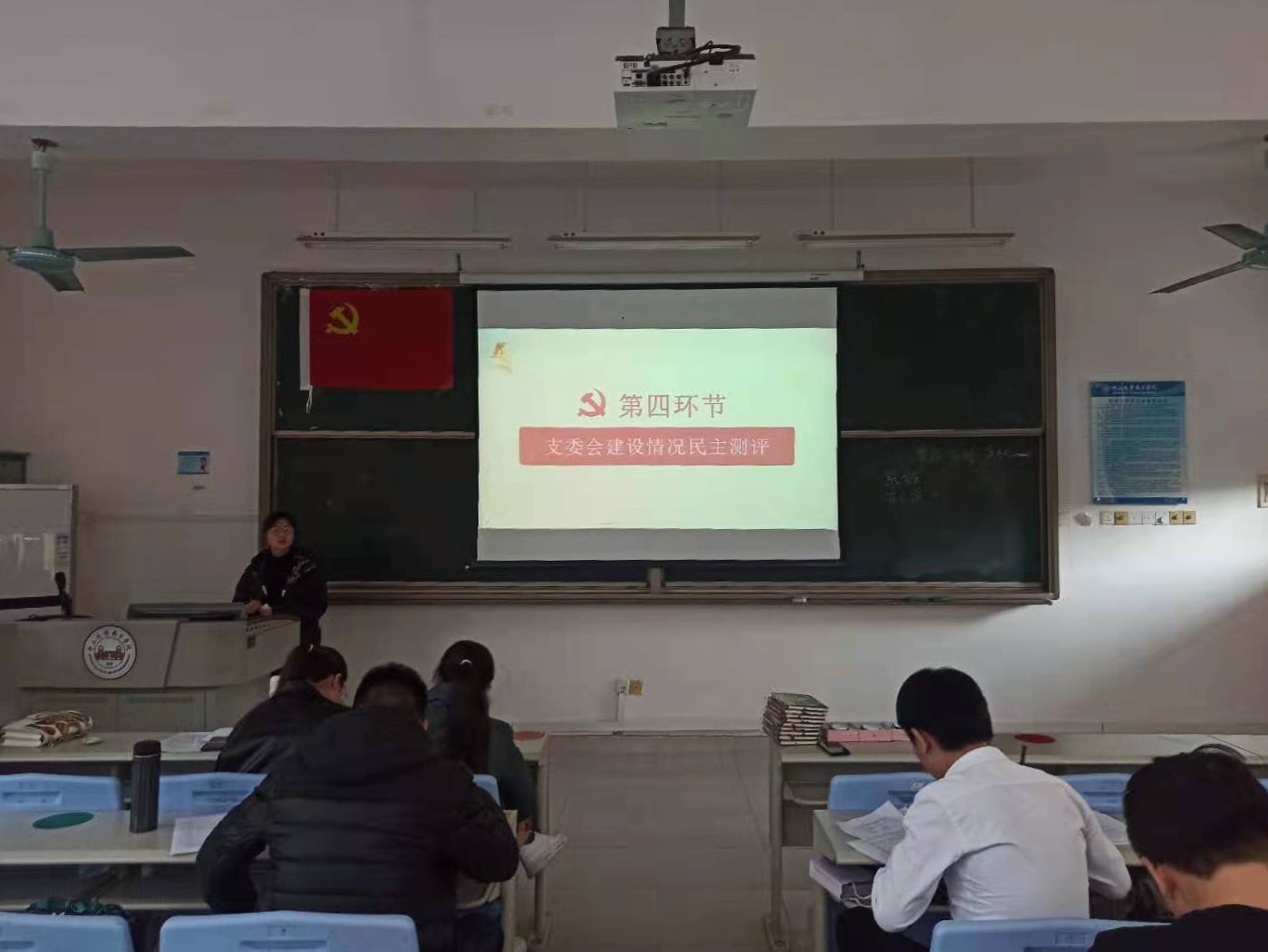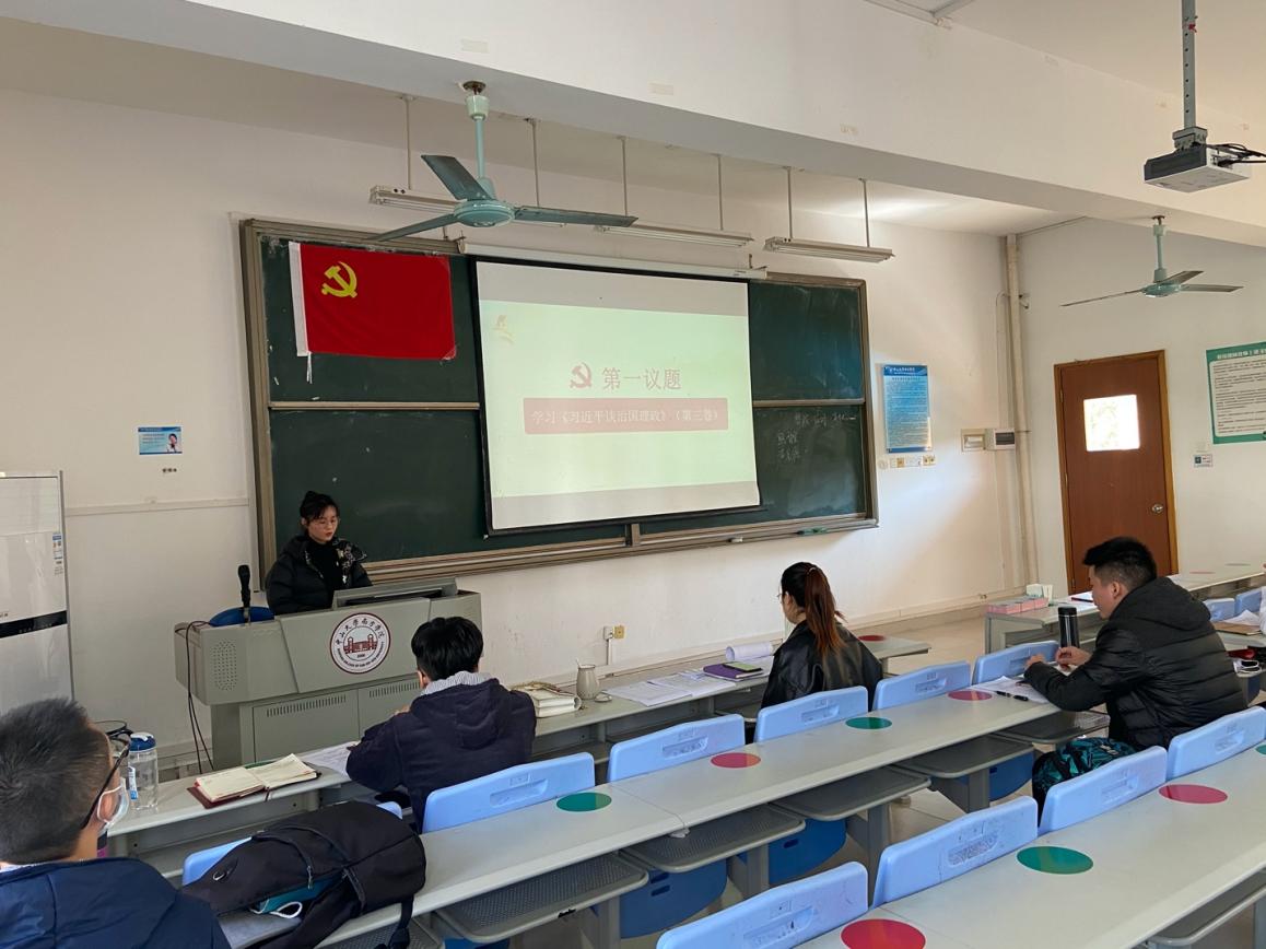 陈金涛老师从谈心谈话、支部发展党员、“三会一课”制度落实、党费收纳和使用、支部活动开展、党建带团建、学习强国积分、年度内党员参加组织生活、支部存在问题和未来展望等方面,向全体参会人员汇报了这一年来党支部的工作情况。