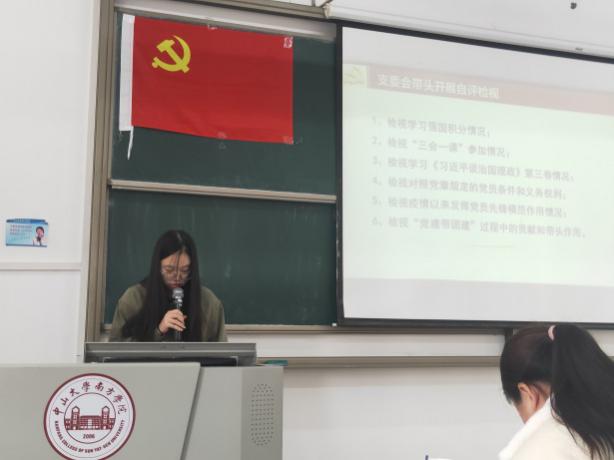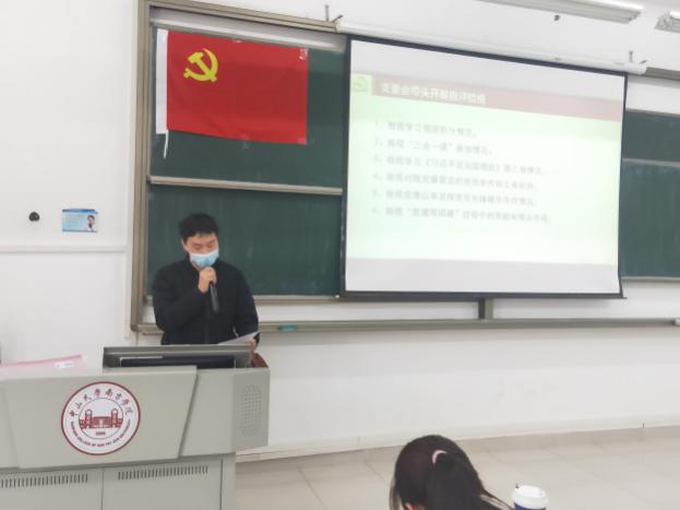 孙大伟老师从“三会一课”制度落实情况、“党建带团建”活动形式与载体、“不忘初心,牢记使命”主题教育系列活动、主题党日活动、党费收缴、学习强国积分和打卡情况、党校团校建设、发展党员工作、宣传工作和公众号传播影响力、支部品牌活动、学生会改革工作、支部成员奖学金获奖情况、志愿服务和社会实践情况等多个方面,向与会人员汇报了这一年来党支部的工作情况。