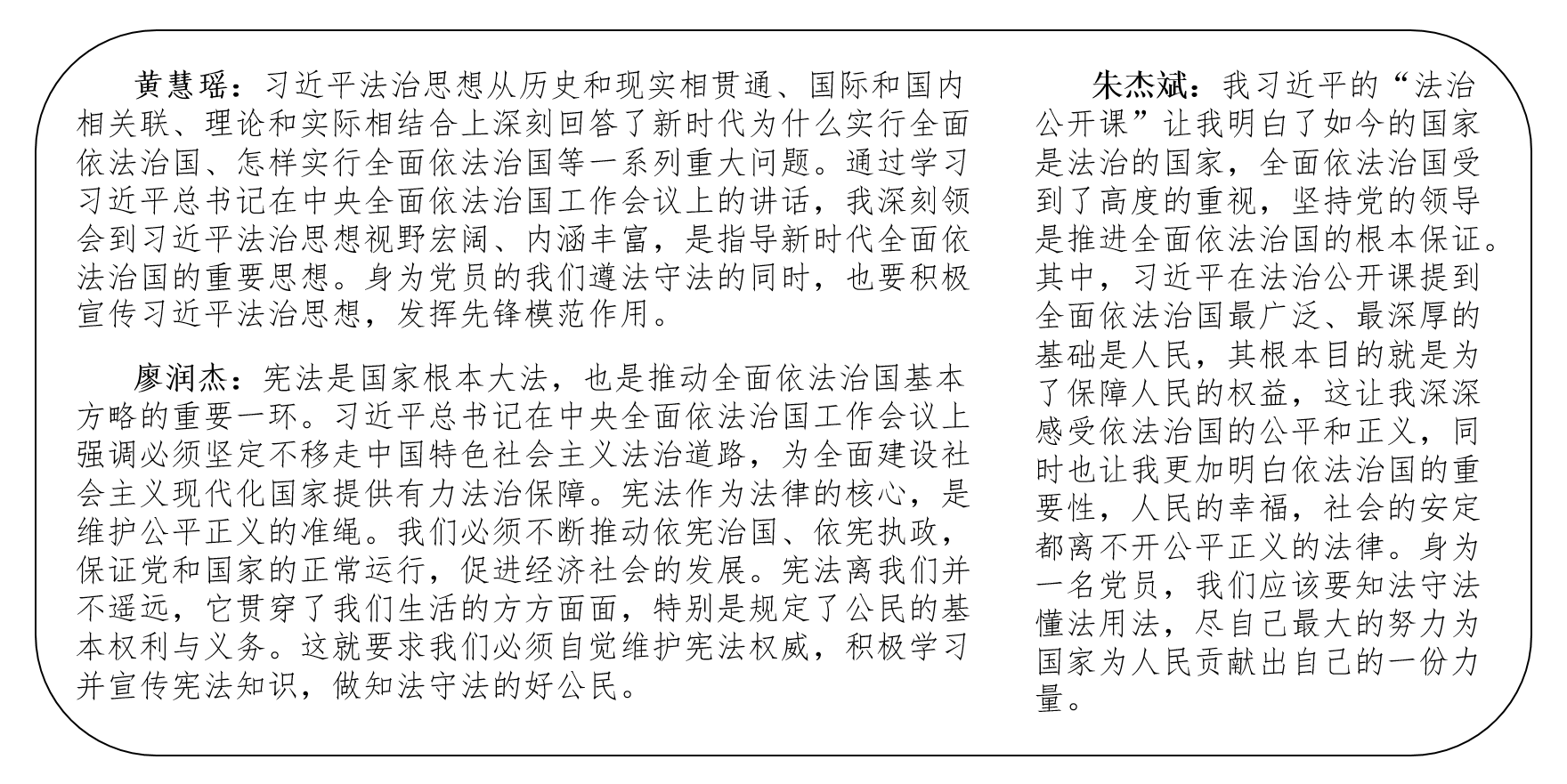 12月4日是国家宪法日,宪法是国家的根本大法,是治国安邦的总章程。宪法具有最高法律效力,所有法律、法规都不得同宪法相抵触。作为大学生党员,我们应该不断加强对于宪法的了解和学习,因此会议第二部分首先是由黄诗懿同志带领所有组员一起学习“习近平的法治公开课”,并在课后总结交流自己的所学所想,最后由黄诗懿同志做总结。