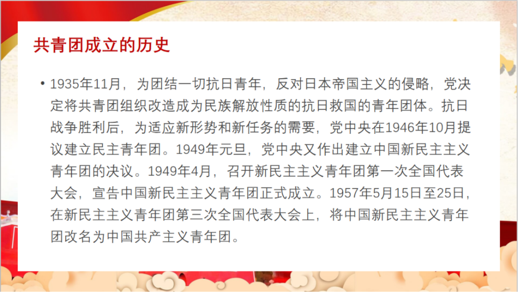 团课小老师讲到,身为团员,处在共青团这个组织中,我们要清楚了解共青团成立的历史背景和发展过程,增强个人的团员意识,奠定思想基础。