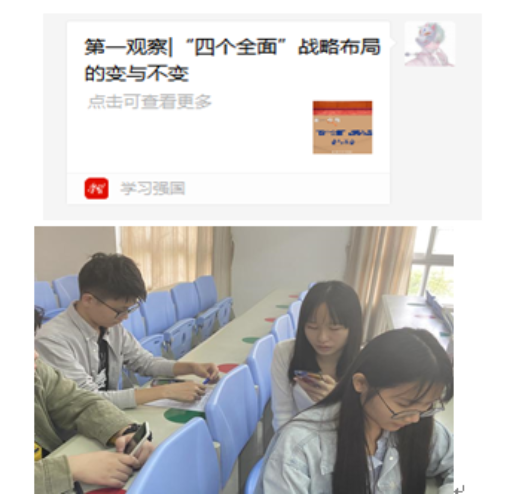 由陈博正同志组织其他同志在线下课室开展本次活动的主题,带领大家一起学习“四个全面”战略布局的变与不变》文章,学习完后,于2020年11月15日在3-303课室进行交流分享,并且写下自己的学习心得。