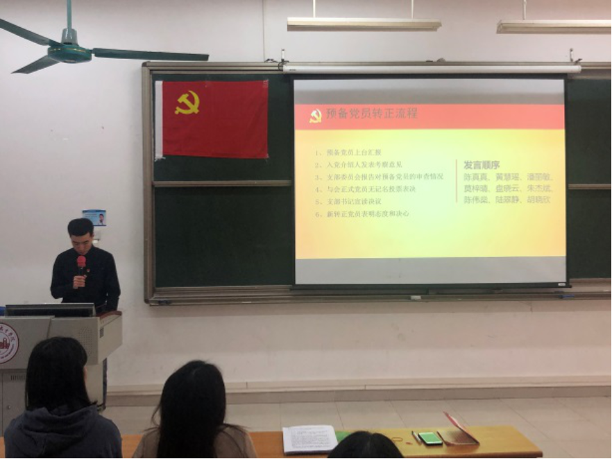 陈真真等9名同志依次上台汇报自己这一年来的思想、工作、生活与学习四个方面,以及汇报了对自身对党的认识与个人在预备期期间的进步。党组织严格按照会议流程对这9名同志进行逐个审查、讨论、投票和表决。经会议表决,同意陈真真等9名同志按期转为中共正式党员,会后本支部将按照程序上报学院党总支审批。
