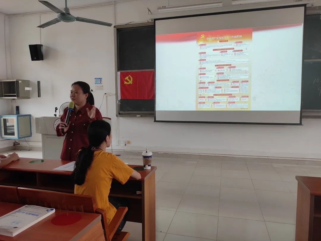 唐玉婷老师首先向我们阐述了学生党员发展流程,入党的过程是缓慢的,但从中我们可以收获许多宝贵的精神财富。让学生党员在这个过程中逐步成长,从实践中磨炼自己。