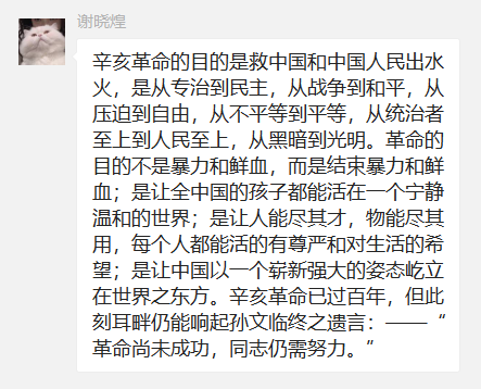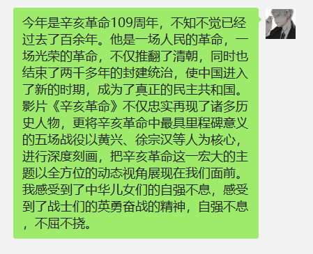 今年是辛亥革命109周年,随着时光的流逝,历史的硝烟已经散尽,但革命精神和革命情怀却永远会留在后人的心中,往往让人不禁悼念。电气学院学生第二党支部第三党小组于2020年10月14日在线上微信群开展围绕辛亥革命109周年纪念主题开展分享心得体会讨论。本次会议由学生第二党支部第三党小组何新宇组织,李钰盈、李琳、谢晓煌共同参与。