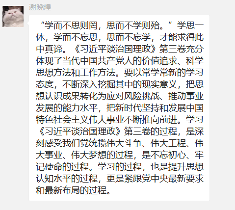 首先,进行的是第一议题,大家共同集中学习了《习近平谈治国理政》第三卷,一起领略了国家政策的变更和发展的巨大变化,感受了习近平新时代中国特色社会主义思想的魅力。