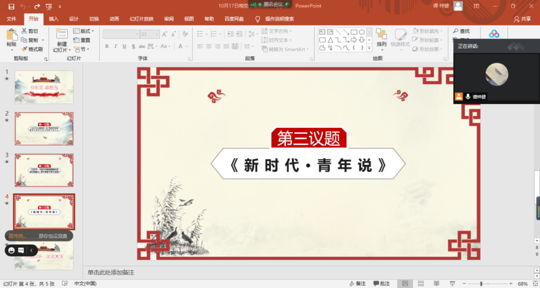 由谭梓健同志组织其他同志在线上开展本次活动的主题,学习理论视频《新时代·青年说》,每集大概15分钟,各位通知自行观看完毕后,于2020年10月17日在腾讯会议平台上进行交流分享,并探讨有自身能够改进的地方。