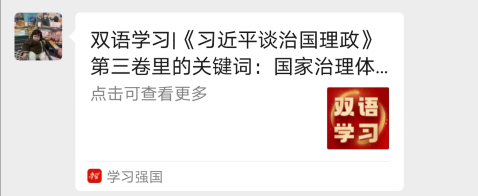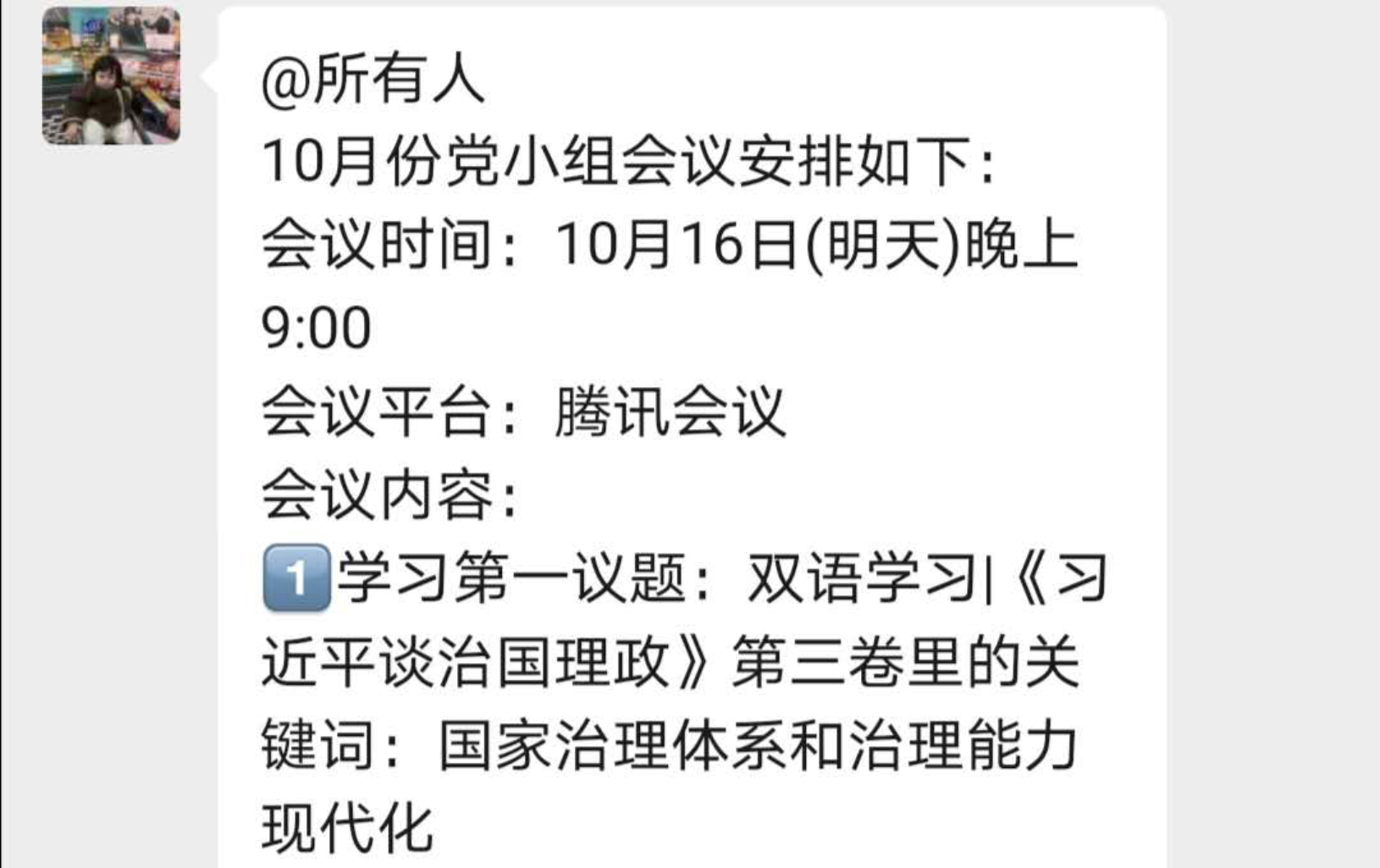 会议第一项,由黄慧瑶同志带领全体小组成员学习双语学习《习近平谈治国理政》第三卷里的关键词:国家治理体系和治理能力现代化。通过第一议题的学习,小组党员明白了无论是完善中国特色社会主义制度,还是推进社会治理体系和治理能力现代化, 只有做到与时俱进,牢固自身根基、立足自身优势,补齐自身短板,强化自身弱项,才能实现为中国人民谋幸福,为中华民族谋复兴的远大中国梦。