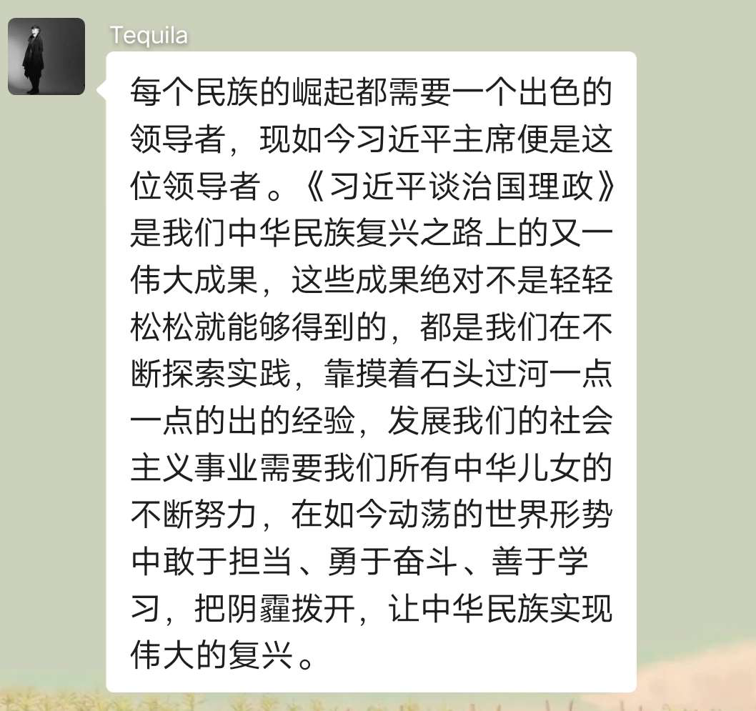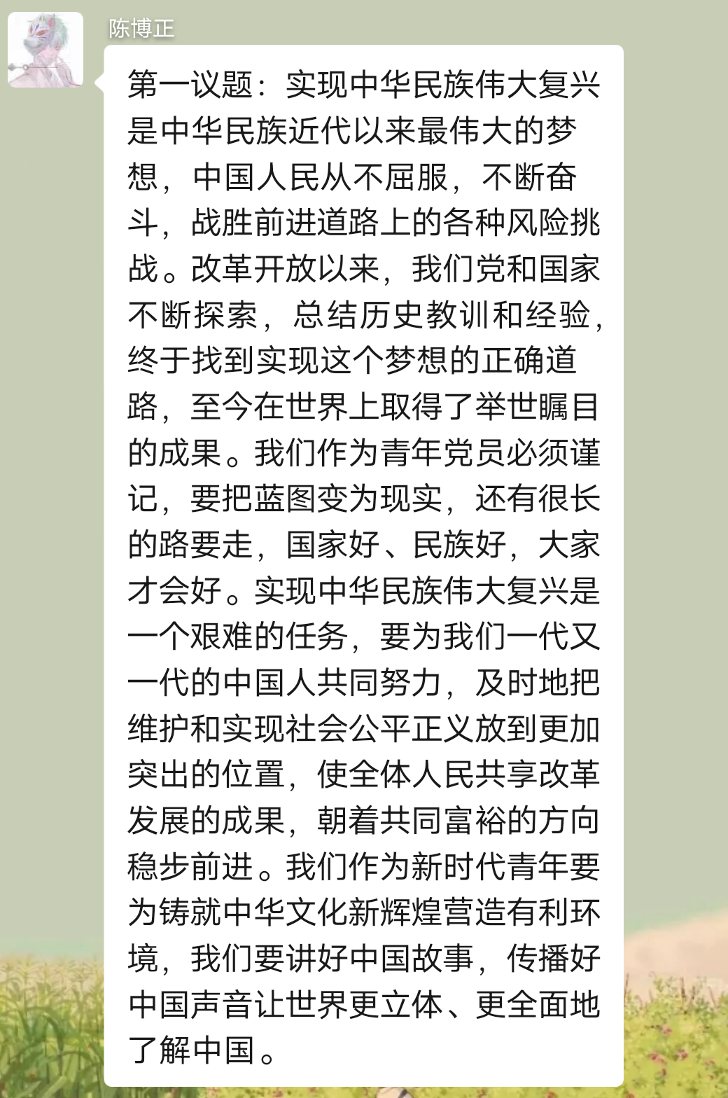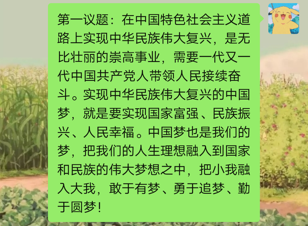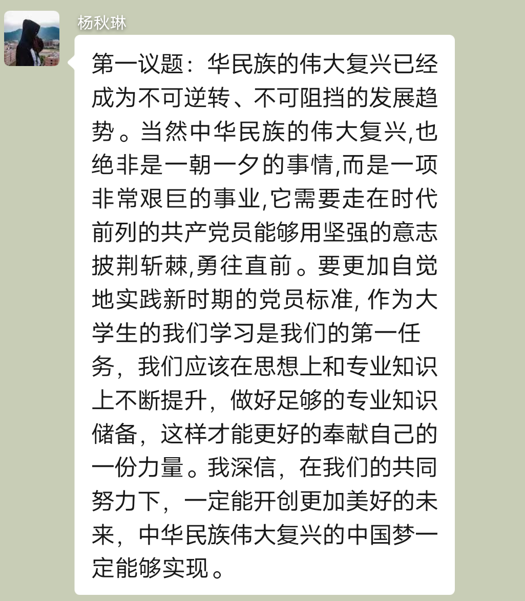 陆翠静同志在党小组会上总结了第一议题相关内容的学习,第一议题学习的是《习近平谈治国理政》第三卷里的关键词:中华民族伟大复兴。中华民族伟大复兴不是轻轻松松就能实现的,需要靠13亿多的中国人民一齐努力,共同奋斗。奋斗也是我们青春最亮丽的底色,我们在青春年华的时候,也要不懈努力,撸起袖子加油干,在为自己的青春、国家奋斗的同时,也要坚守自己最初的那颗心。