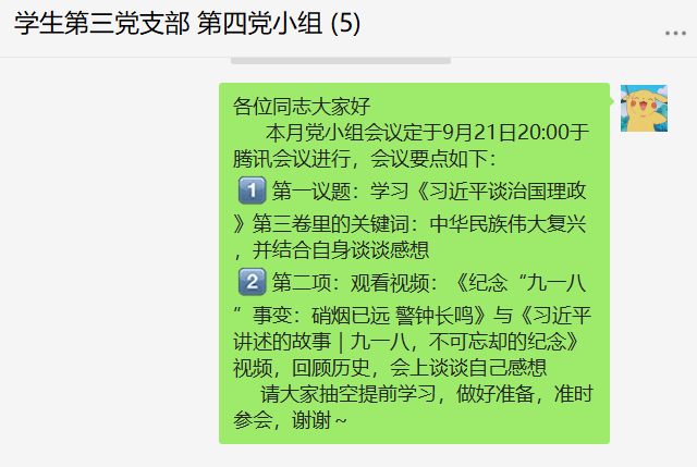 为了深入学习习近平新时代中国特色社会主义思想,增强学生党员的思想意识,电气学院学生第三党支部第四党小组于2020年09月21日20时积极利用腾讯会议平台,开展了一系列线上主题学习会。本次会议主要以线上学习和感想交流的方式开展学习。会议由第四党小组的陆翠静同志主持并做相关记录,第四党小组全体党员出席本次会议,本次会议共开展两项内容。