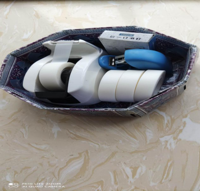 马振超:对平常废旧的扑克牌进行二次创造,折叠拼接,用胶带加以固定,制作成环保收纳盒,精致又美观,可以收纳杂物同时节省空间。