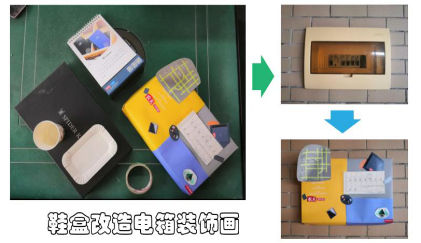 翁俊楷:闲置的鞋盒盖子经过加工和美化,充分发挥自己的想象,可以做成家用电箱的外装饰画。一方面利用了闲置无用的资源,另一方面又美化了原本单调普通的配电箱。