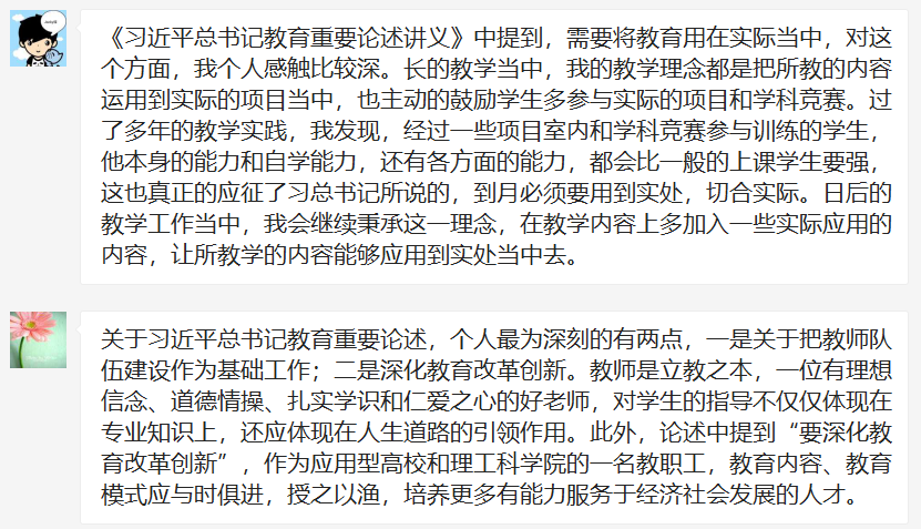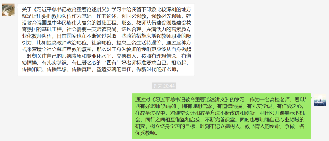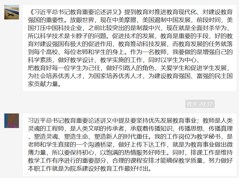 会议开始,由程佳兵同志就如何理解《习近平总书记教育重要论述讲义》中的关于教育论述的重大意义和如何深刻理解、准确把握习近平总书记关于教育的重要论述的科学内涵进行了简要介绍。学习相关知识后各党员老师在微信群谈谈关于对“九个坚持”的见解。