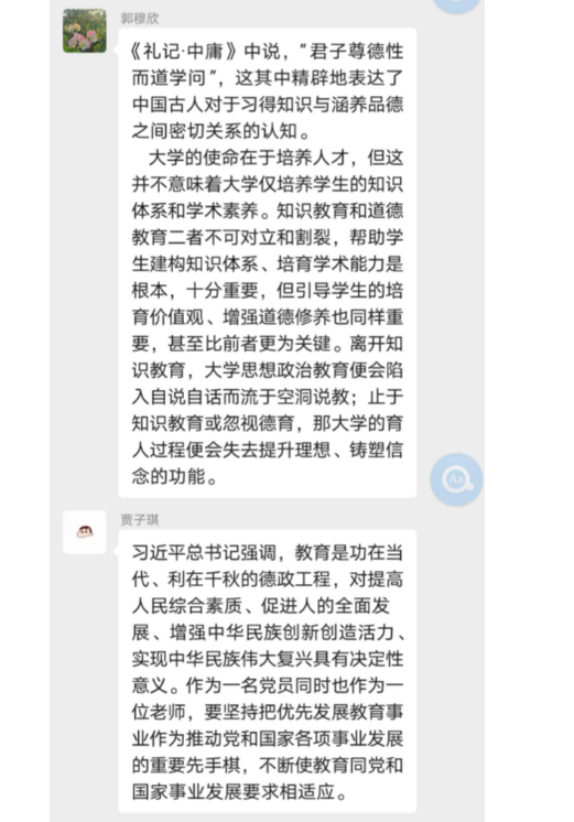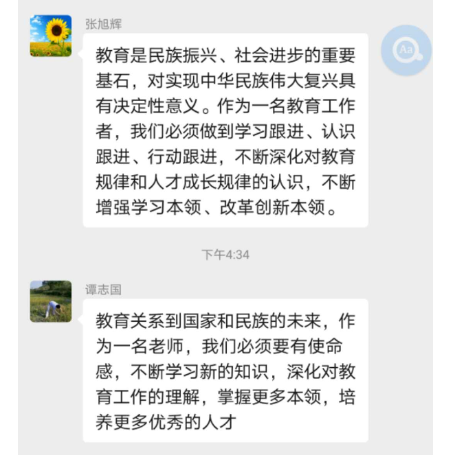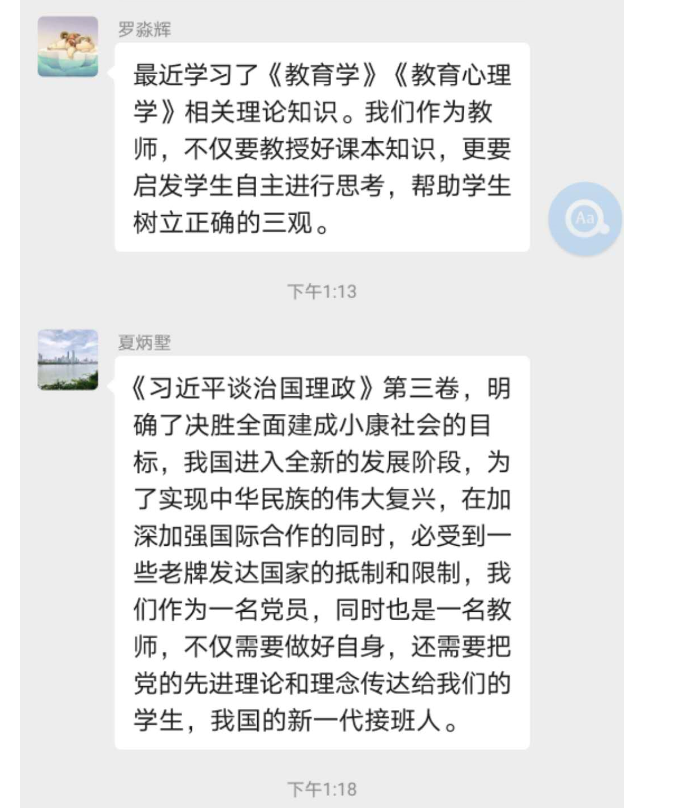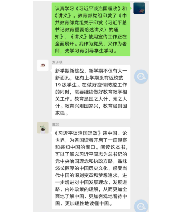 会议伊始,第一议题:由原伟同志就如何理解《习近平总书记教育重要论述讲义》中的关于教育论述的重大意义和如何深刻理解、准确把握习近平总书记关于教育的重要论述的科学内涵进行了简要介绍。然后组织各位与会同志,就学习相关知识在先讨论,并把各为党员老师的认识与想法在微信群进行相互交流。