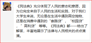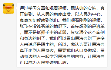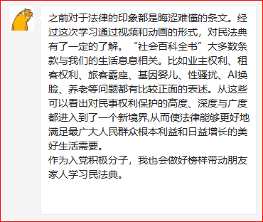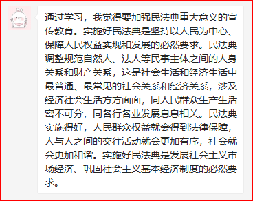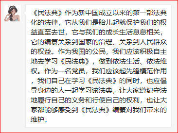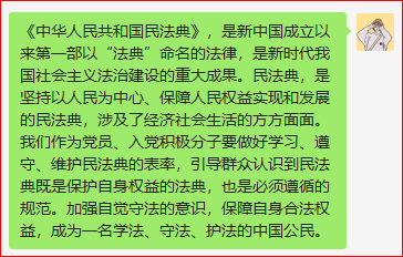 为了贯彻学习我国成立以来的的第一部成文法典化法律——《中华人民共和国民法典》。学生第三党支部第一学习小组于2020年08月23日21:00积极利用腾讯会议平台,开展了线上主题学习会。本次会议主要以线上学习和感想交流的方式开展学习了《中华人民共和国民法典》的相关内容。