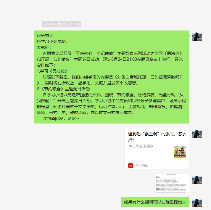 2020年8月24日晚上9点学生第三党支部第四学习小组在腾讯会议平台上由杨秋琳同志带领大家一起学习《民法典》——刘备白帝城托孤,口头遗嘱算数吗?并带领大家一起讨论分享。