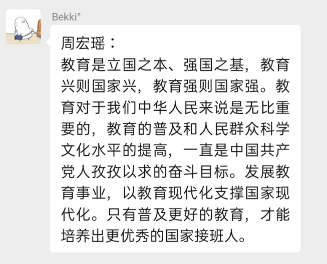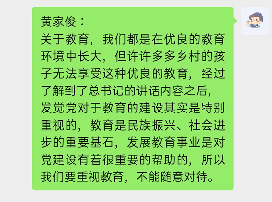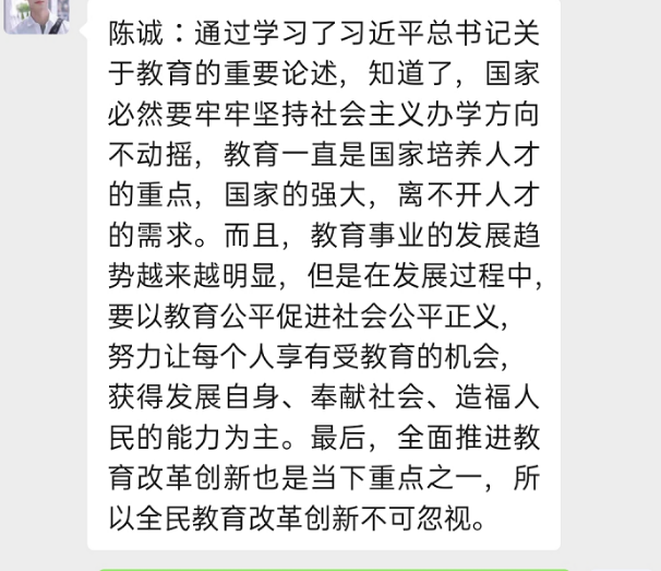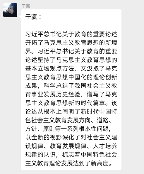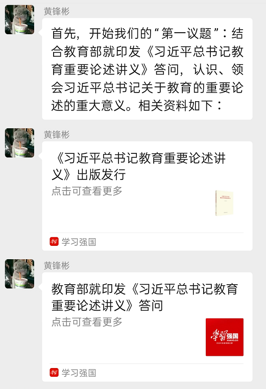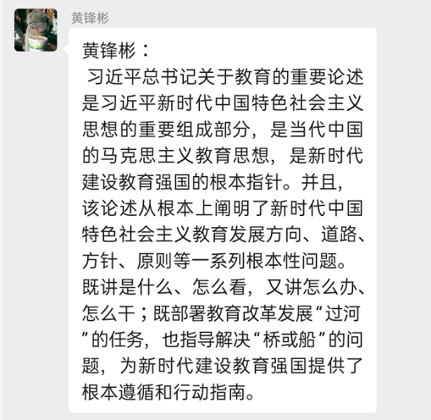 会议第一议题,结合教育部就印发《习近平总书记教育重要论述讲义》答问,认识、领会习近平总书记关于教育的重要论述的重大意义。党的十八大以来,习近平总书记把握世界发展大势,立足党和国家工作全局,就事关中国教育改革发展的方向性根本性战略性问题,作出了一系列重要讲话、指示批示,提出了一系列新理念新思想新观点,形成了习近平总书记教育重要论述。从中我们可以看到,习近平总书记关于教育的重要论述是习近平新时代中国特色社会主义思想的重要组成部分,是当代中国的马克思主义教育思想,是新时代建设教育强国的根本指针。习近平总书记关于教育的重要论述为加快推进教育现代化、建设教育强国、办好人民满意的教育提供了行动指南。在学习过后,大家都相继分享了心得。
