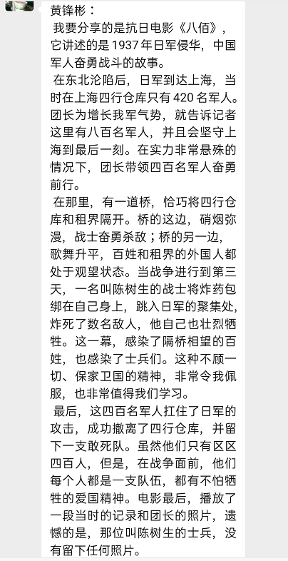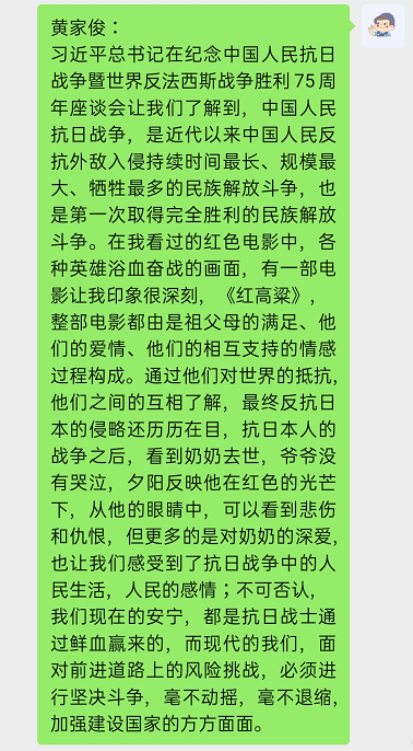 2020年9月11日20:30,电气学院学生第二党支部第二党小组于线上开展学习习近平总书记在纪念中国人民抗日战争暨世界反法西斯战争胜利75周年座谈会上的讲话心得交流会。本次会议由学生第二党支部第二党小组黄锋彬同志组织,周宏瑶同志、陈诚同志、黄家俊同志以及于瀛同志共同参与。