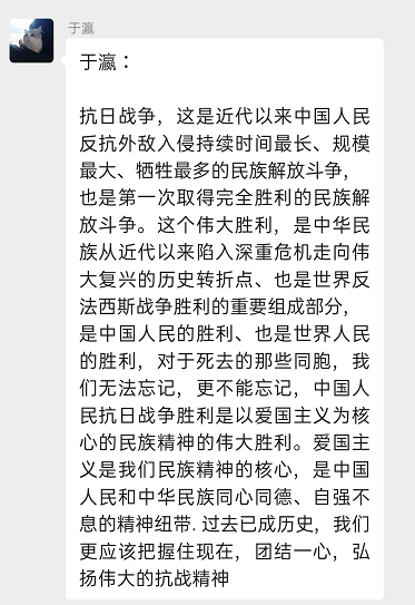 会议第二环节,“不忘初心、牢记使命” 结合习近平总书记在纪念中国人民抗日战争暨世界反法西斯战争胜利75周年座谈会上的讲话,分享讨论心得体会。