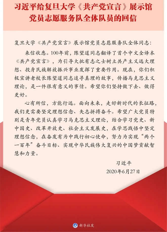 首先,学习习近平给复旦大学《共产党宣言》展示馆党员志愿服务队全体队员的回信。从回信中,习近平总书记呼吁广大青年党员认真学习马克思主义理论,结合学习党史,新中国史,改革开放史,社会主义发展史。在学思践悟中坚定理想信念,在奋发有为中践行初心使命,努力为实现“两个一百年”奋斗目标,实现中华民族伟大复兴的中国梦贡献智慧和力量。作一名合格的马克思主义的传播者和新时代中国特色社会主义的建设者!