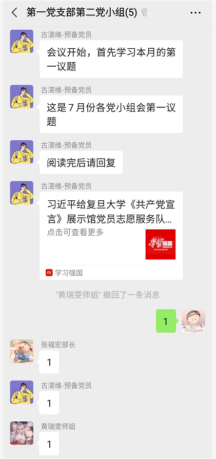 本次会议由学生第一党支部第二小组古湛维同志组织,曲楠楠同志、张福宏同志、黄瑞雯同志、李影同志共同参与。