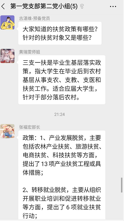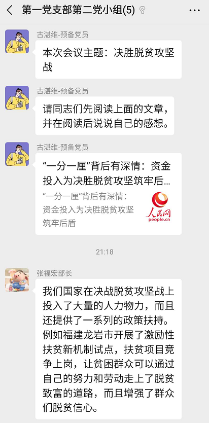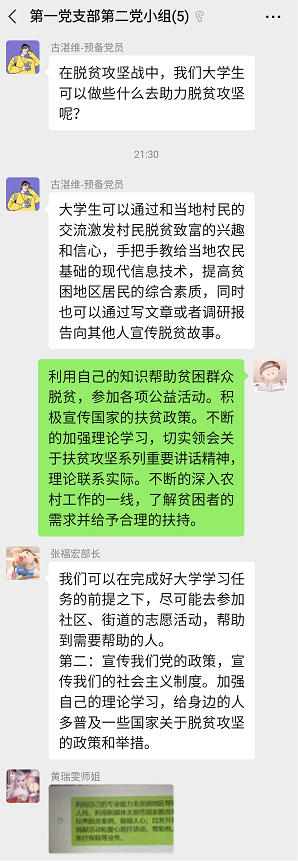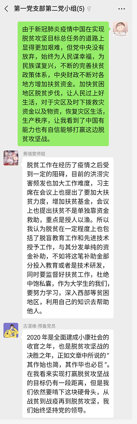 为了贯彻落实习近平总书记关于打赢脱贫攻坚战的重要指示精神。2020年07月21日21点00分,电气学院学生第一党支部第二党小组,在微信上举行了线上党小组会议,进行了关于“决胜脱贫攻坚战”的讨论学习。