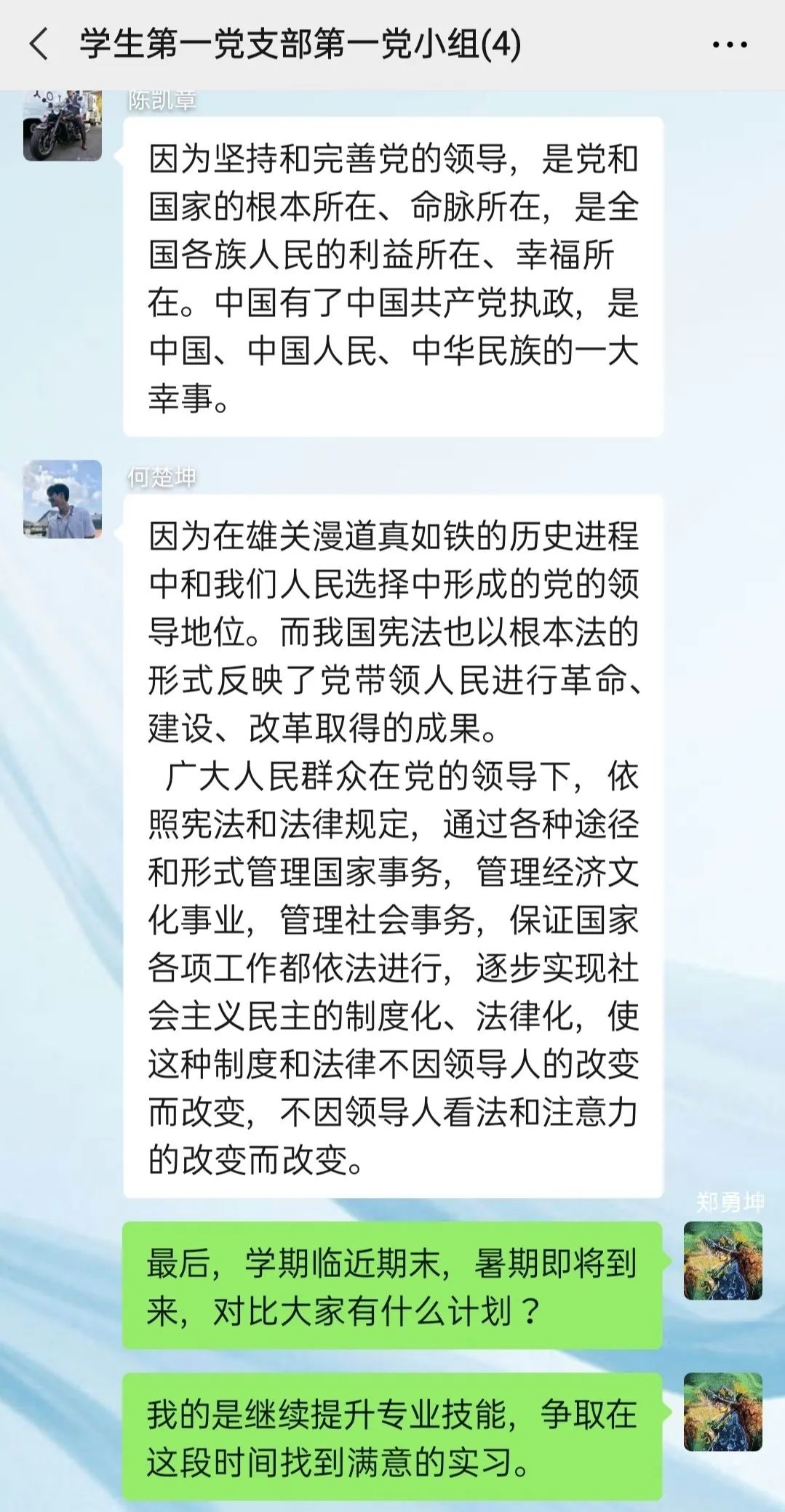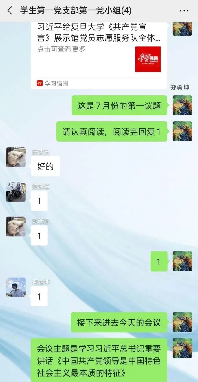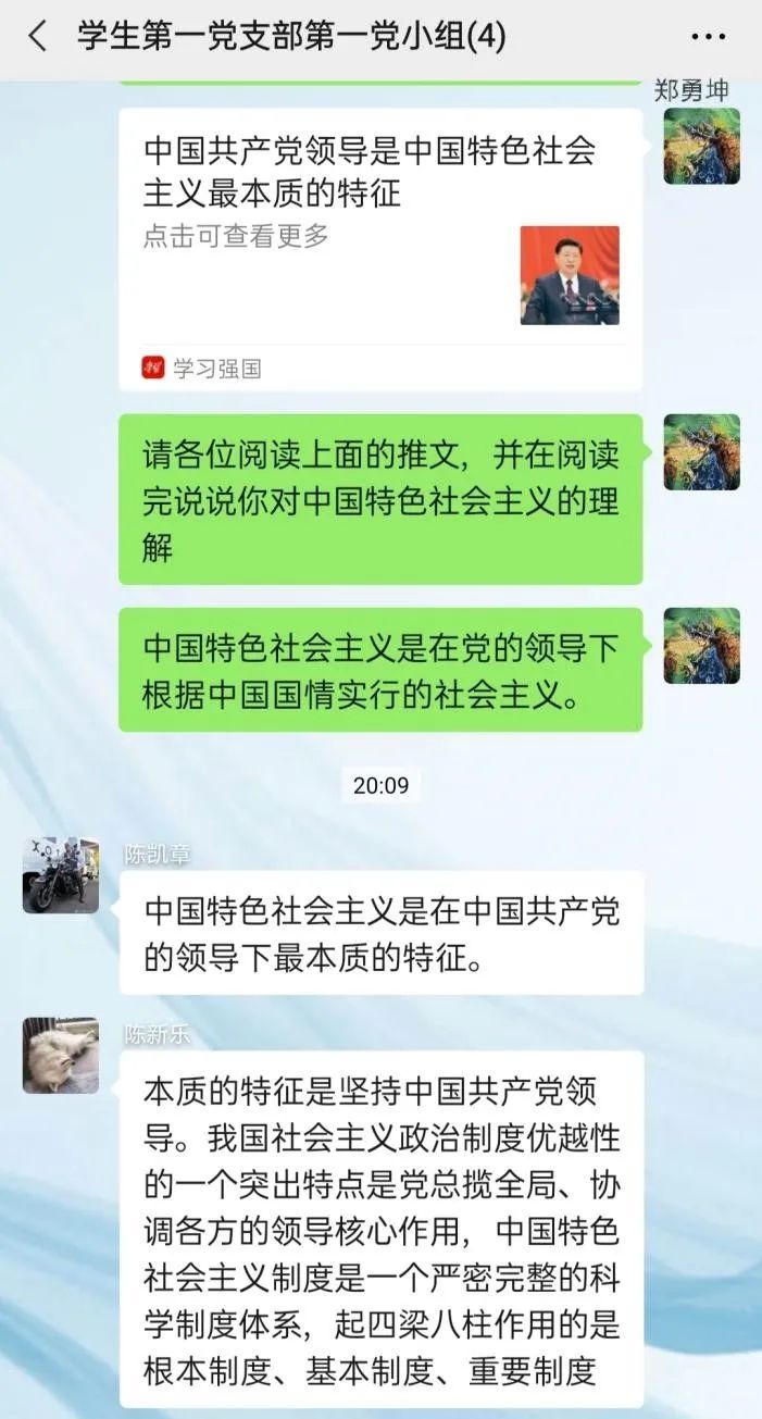 2020年07月17日20点00分,电气学院学生第一党支部第一党小组,开展线上学习讨论,小组所有成员就习近平总书记重要讲话《中国共产党领导是中国特色社会主义最本质的特征》进行学习和讨论。