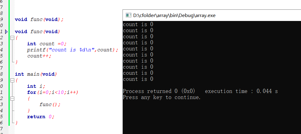 static使得局部变量具有静态存储期,所以它的生存期与全局变量一样,直到程序结束才释放