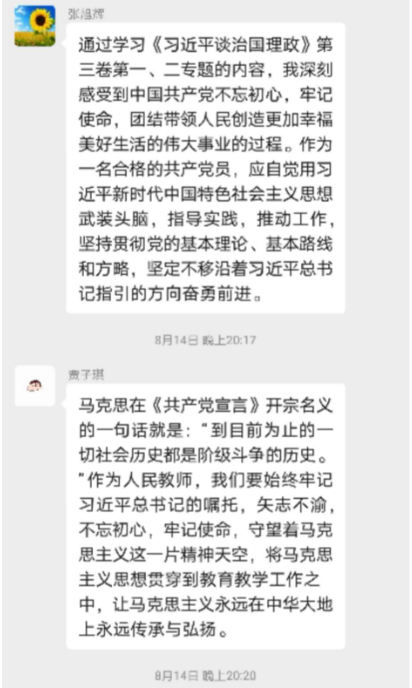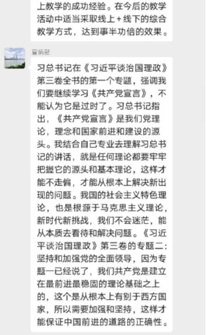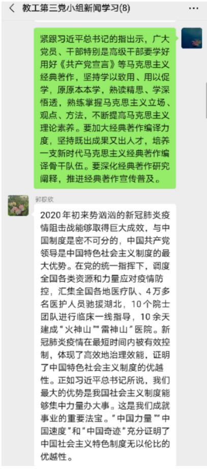 会议开始,原伟通知就《习近平谈治国理政》第三卷第一、第二专题的内容,介绍了《谱写新时代中国特色社会主义新篇章》和《坚持和加强党的全面领导》内容。要深刻感悟和把握马克思主义真理力量,坚定马克思主义信仰,追溯马克思主义政党保持先进性和纯洁性的理论源头,坚持和加强党的全面领导,提高全党运用马克思主义基本原理解决当代中国实际问题的能力和水平不断谱写新时代坚持和发展中国特色社会主义新篇章。学习专题后大家在微信讨论群中踊跃发表感想和学习心得。