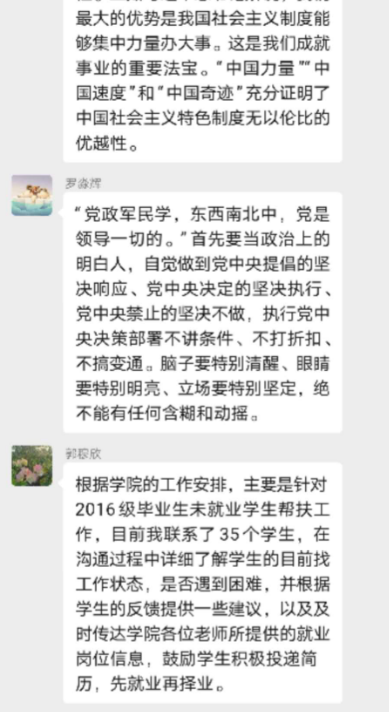 结合工作情况,践行党的理念,讨论组织教职员工线上教学和疫情对未就业毕业生进行帮扶指导事情。