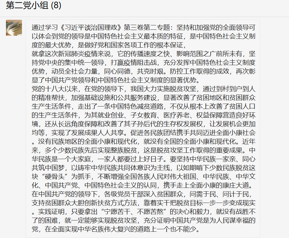 会议开始,由程佳兵同志就《习近平谈治国理政》第三卷第二专题的内容,介绍了“中国特色社会主义最本质的特征是中国共产党领导,中国特色社会主义制度的最大优势是中国共产党领导,党是最高政治领导力量,党是领导一切的。“