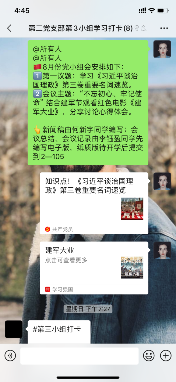 八一建军节到来,为此,我们开展了结合建军节开展了电气学院学生第二党支部第三小组八月份会议。由于暑假原因,第三党小组于2020年8月18日在线上微信群开展,本次会议由学生第二党支部第三党小组何新宇同志组织,李钰盈同志、李琳同志,谢晓煌同志共同参与。