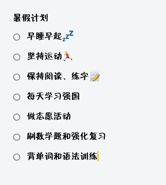 计划假期狂补英语预备9月份回校后的CET六级考试,方式为自购书籍练习且使用考虫之类的APP进行线上听课;其次,将利用流利说APP的线上课程补习英语口语,可能会报新东方课程班;最后,准备考驾照。