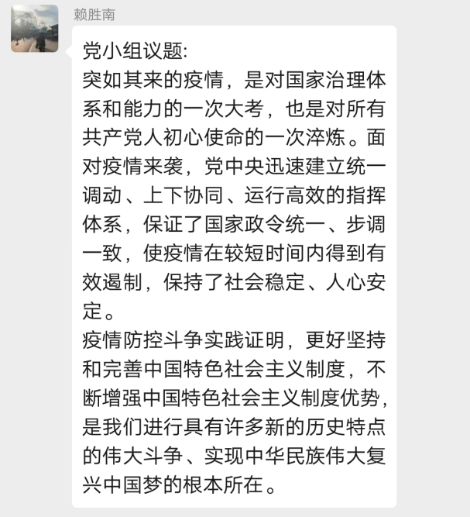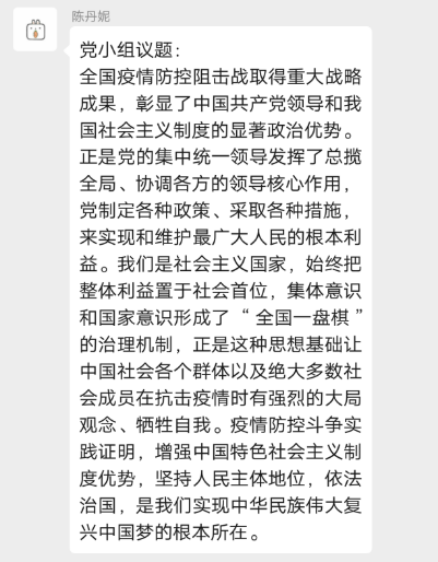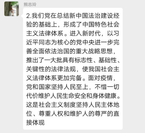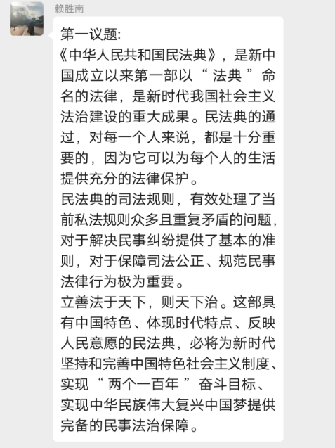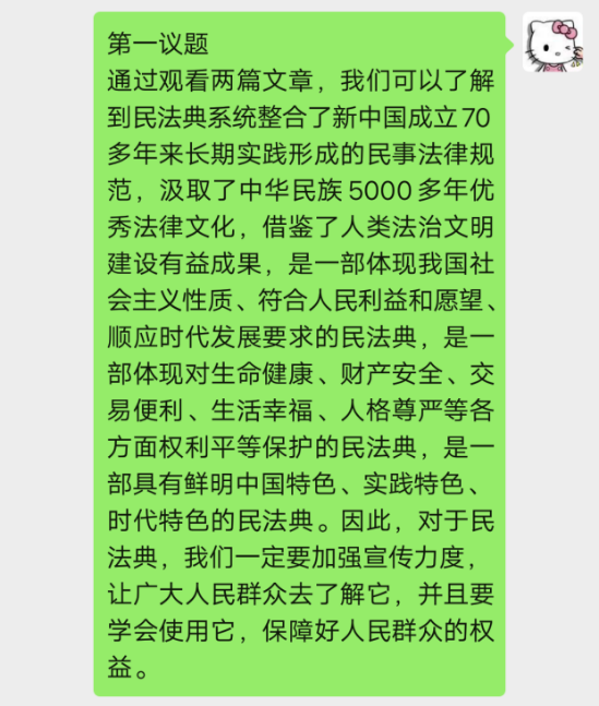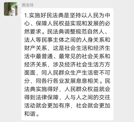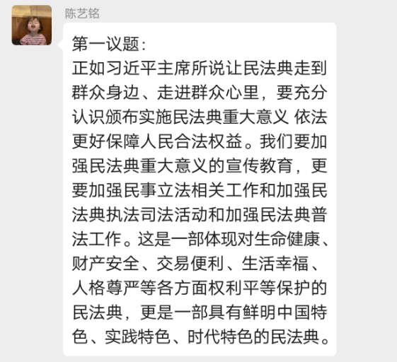 在陈艺铭同志的主持下,大家认真学习讨论了《习近平:充分认识颁布实施民法典重大意义 依法更好保障人民合法权益》和《每日金句|习近平论让民法典走到群众身边、走进群众心里》两篇文章。在线上,我们在各自观看、学习完两篇文章后,由姚婉清同志带头发表自己的学习感受,党小组其他同志积极参与讨论,并纷纷发表了自己的学习体会。