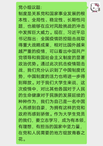 会议第二项,我们继续阅读、学习《关键时刻,更见中国制度优势》这篇文章,学习并撰写观后感,并在小组内对此次学习主题进行讨论和学习。