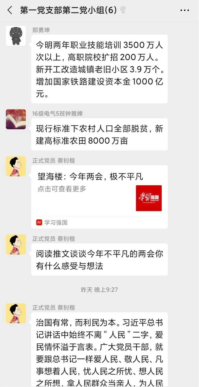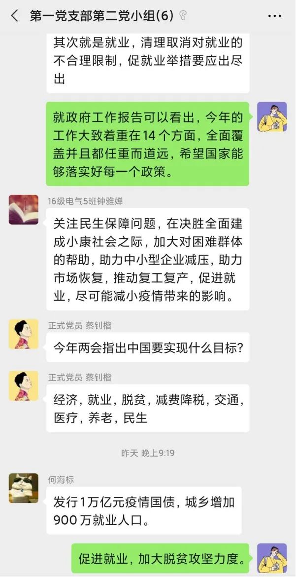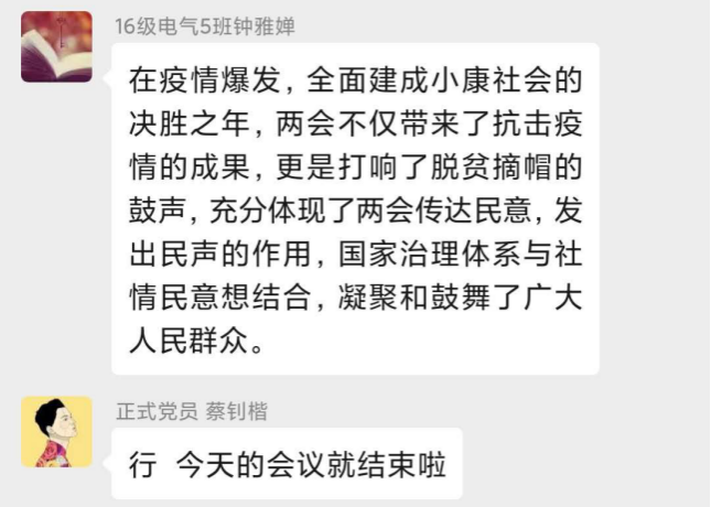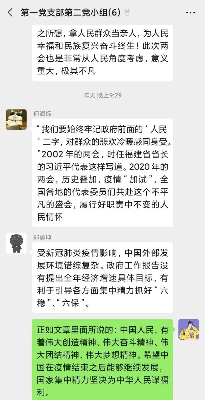 2020年05月22日21:00,电气学院学生第一党支部第二党小组开展线上学习讨论,小组所有成员就“聚焦两会、关注两会”进行学习与讨论。