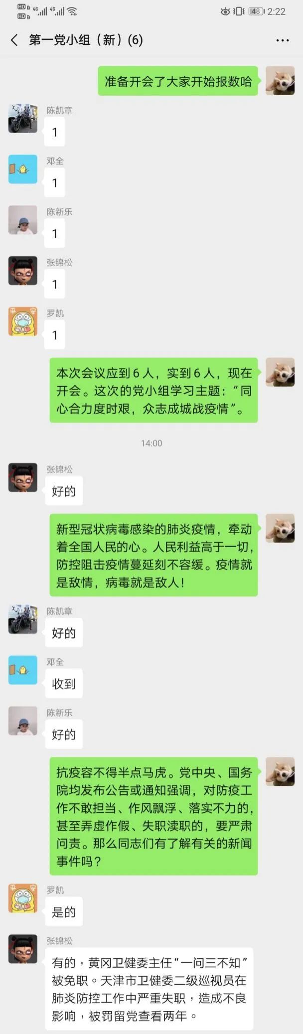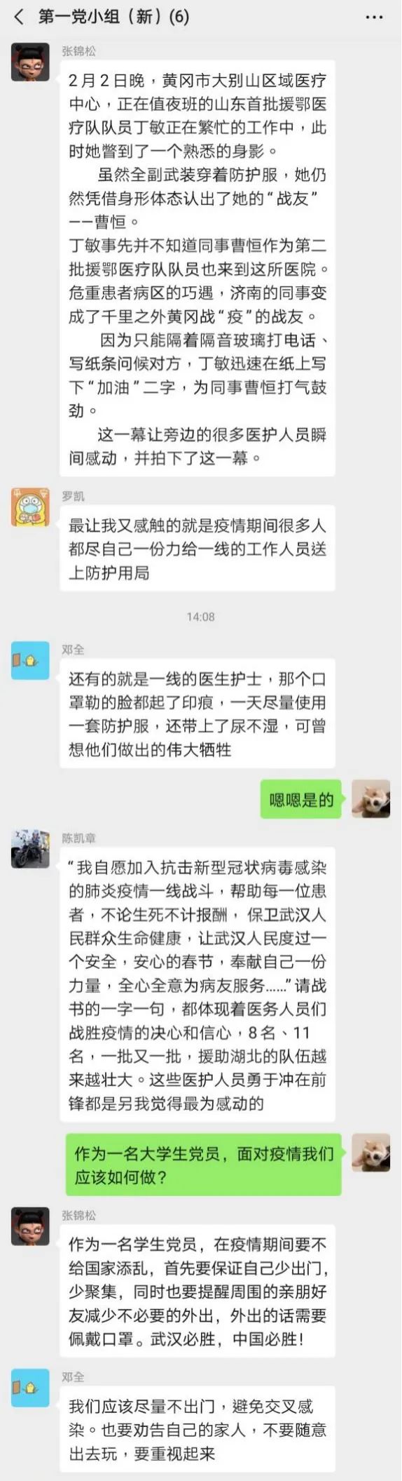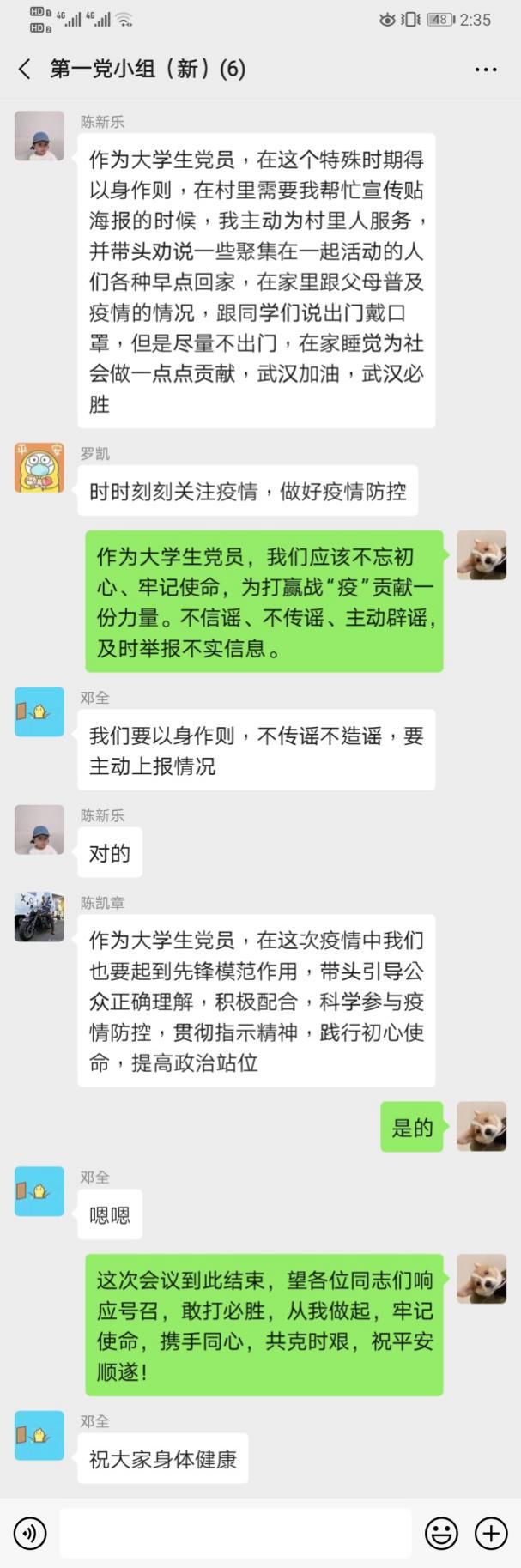 为了认真贯彻习近平总书记关于打赢疫情防控阻击战的重要指示精神。2020年2月9日14:00,电气学院学生第一党支部第一党小组开展线上学习讨论会议。