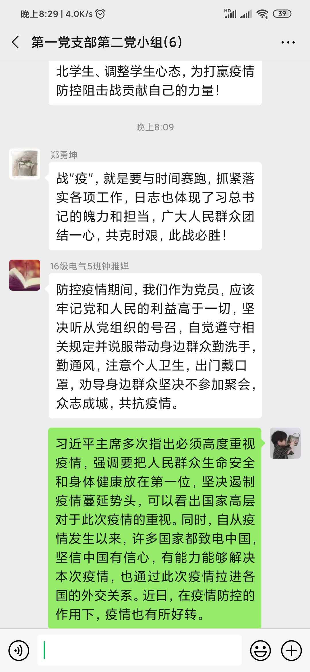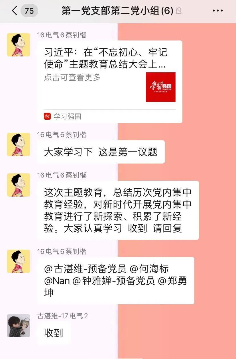 为了进一步落实中共中央发出《关于加强党的领导,为打赢疫情防控阻击战提供坚强坚强政治保证的通知》,充分发挥党员先锋模范作用。2020年02月17日20:00,电气学院学生第一党支部第二小组开展线上学习讨论,小组所有成员通过学习“一条时间轴纵览习近平的战‘疫’日记”,讨论在疫情防控阻击战中,我们应该怎么做。