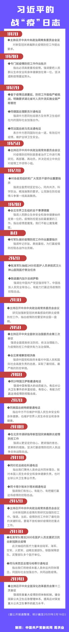 新冠肺炎疫情发生以来,党中央高度重视,习近平总书记亲自部署、亲自指挥,多次召开会议、听取汇报、作出重要指示,要求各级党委和政府及有关部门制定周密方案,组织各方力量开展防控。新时代学习工作室梳理出习近平总书记的战“疫”日志。