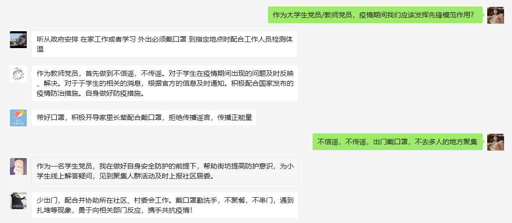 通过学习习总书记下达的重要指示批示的精神,第四党小组成员感受到疫情期间,我们国家社会、人民群众的团结一心,共同为坚决打赢疫情防控阻击战努力。今后的日子里,第四党小组将不忘初心,继续前行,从自身点滴事做起,发挥出党员先锋模范作用,带动身边的同学学习,积极奋斗,为加速社会主义的建设作出自己的贡献!