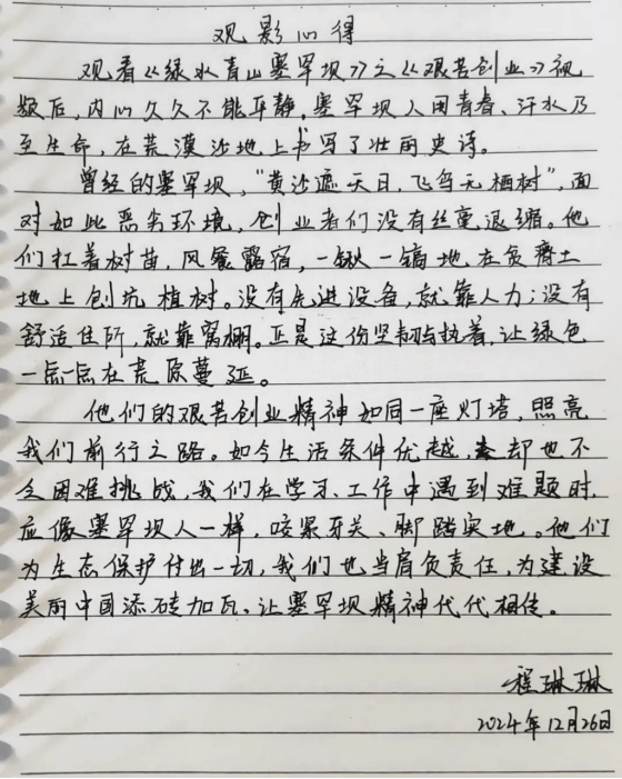 观影过程中,同学们全神贯注,被塞罕坝林场建设者们不畏艰难、无私奉献的精神深深打动。当看到老一辈塞罕坝人在艰苦环境中坚守岗位、默默奉献,甚至为了林场建设牺牲个人利益时,许多同学不禁热泪盈眶;当看到如今塞罕坝林场绿树成荫、生态环境得到极大改善,成为京津冀地区重要的生态屏障和绿色发展示范区时,同学们又不禁为塞罕坝人取得的伟大成就而感到由衷的自豪和钦佩。