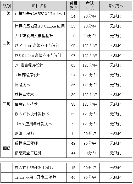 根据教育部考试中心的考试安排与我学院考点的实际情况,2025年下半年全国计算机等级报考时间2025年6月26日10:00时至7月3日16:00时。我校考点可接受报名的科目及说明如下表: