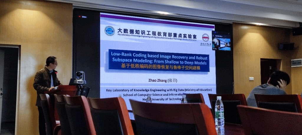 紧接着,张召教授报告《基于低秩编码的图像恢复和鲁棒子空间建模》,介绍了低秩学习模型及其应用和改进。低秩学习是一种表示学习;表示学习经常用在深度学习和机器学习中,让机器来学习特征的表达。传统的表示学习方法可能不能很好的处理图片模糊、缺失等问题,采用低秩的方法可以对图像进行复原处理。张召教授详细地介绍了具体的理论和算法,通过改进了传统算法,来实现对人脸面部有遮挡并且进行模糊处理的情况下进行面部复原,改进后的效果比传统的效果更好。